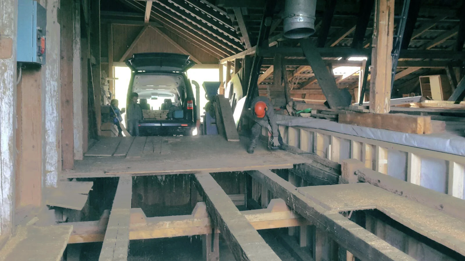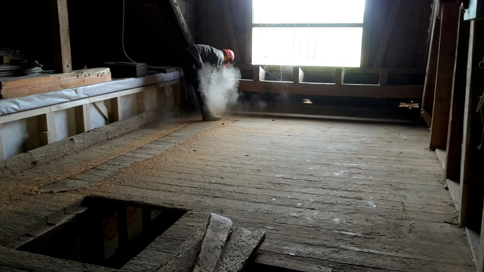 Auf einer solchen Baustelle gibt es natürlich viel Holz. Für Käfer und Ameisen ein gefundenes Fressen. Verwurmte Balken gibt es einige. Aber auch wunderschön gealtertes Holz. Zum Beispiel die Bodenbretter der alten Heubühne.
